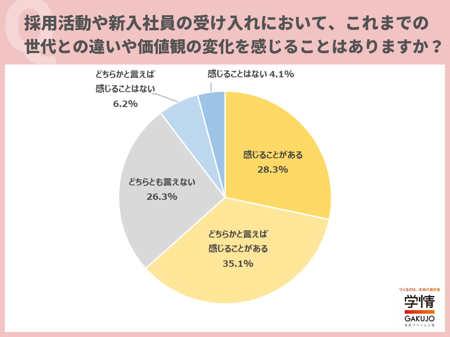 採用活動や新入社員の受け入れにおいて、これまでの世代との違いや価値観の変化を「感じることがある」の回答が28.3%に上りました。「どちらかと言えば感じることがある」35.1%を合わせると、6割以上の人事担当者が価値観の変化を感じるとしています。「『会社の目的と自分自身のキャリアの繋がり』や『自身の成長』を重視する傾向が強い」「転職や自身でキャリアを築くことに意欲的な人が多いと感じる」「どのような経験ができるか、どのようなスキルが身につくかを重視する人が増えていると思う」といった声が寄せられました。