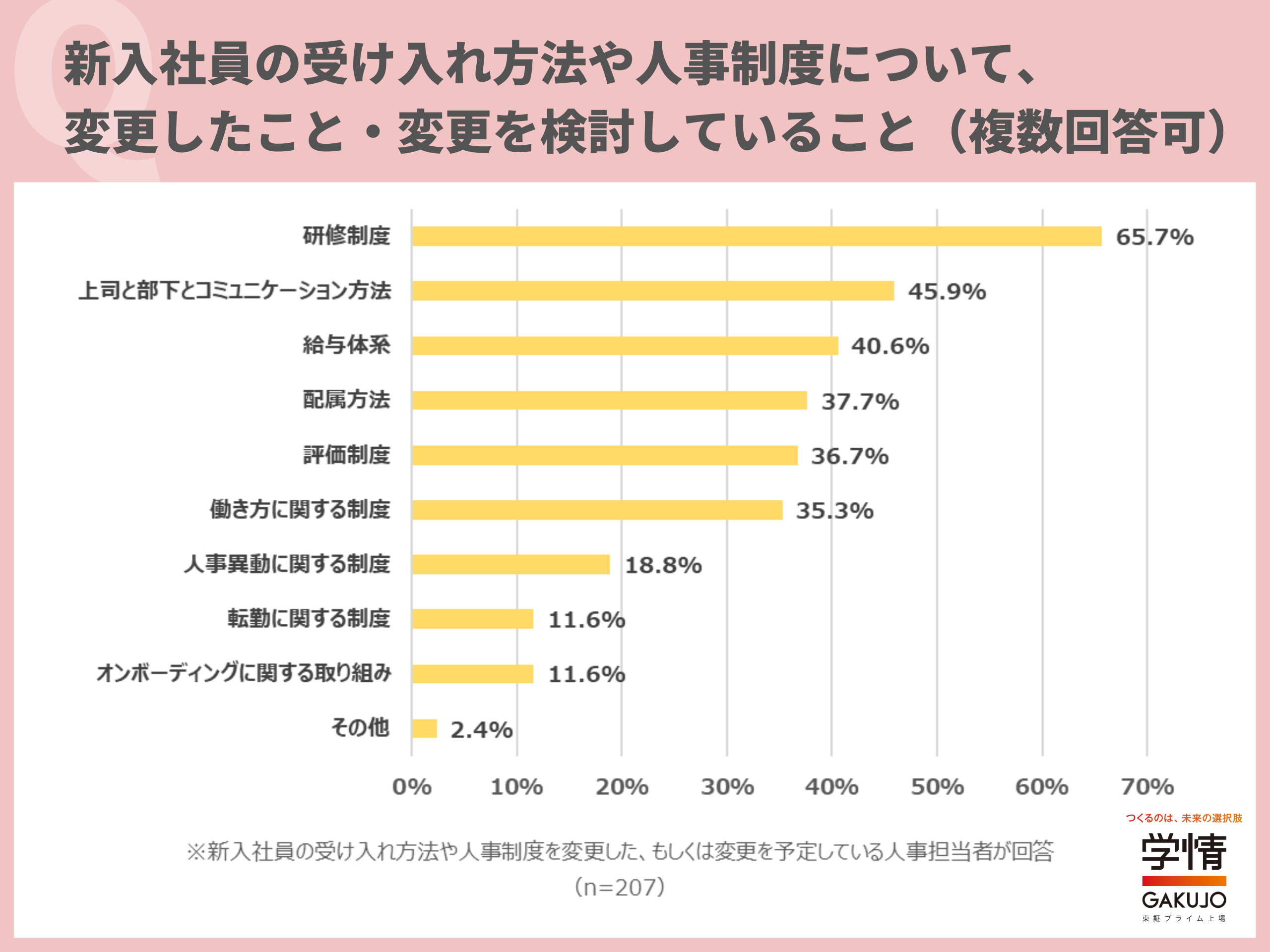 新入社員の受け入れ方法や人事制度について、変更したこと・変更を検討していることは「研修制度」が65.7%で最多。次いで、「上司と部下とのコミュニケーション方法」45.9%、「給与体系」40.6%、「配属方法」37.7%が続きました。