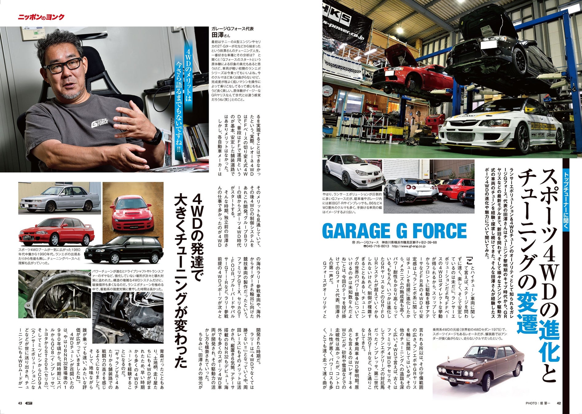 ターボエンジンのパワーをトラクションに換えて余すことなく発揮させるスポーツ4WD。ランサーエボリューションシリーズのチューニングを常に第一線で牽引し続け、現在はGRヤリスでのタイムアタックでその名を馳せるGフォースの田澤さんに、スポーツ4WDへの取り組みについて振り返ってもらう。