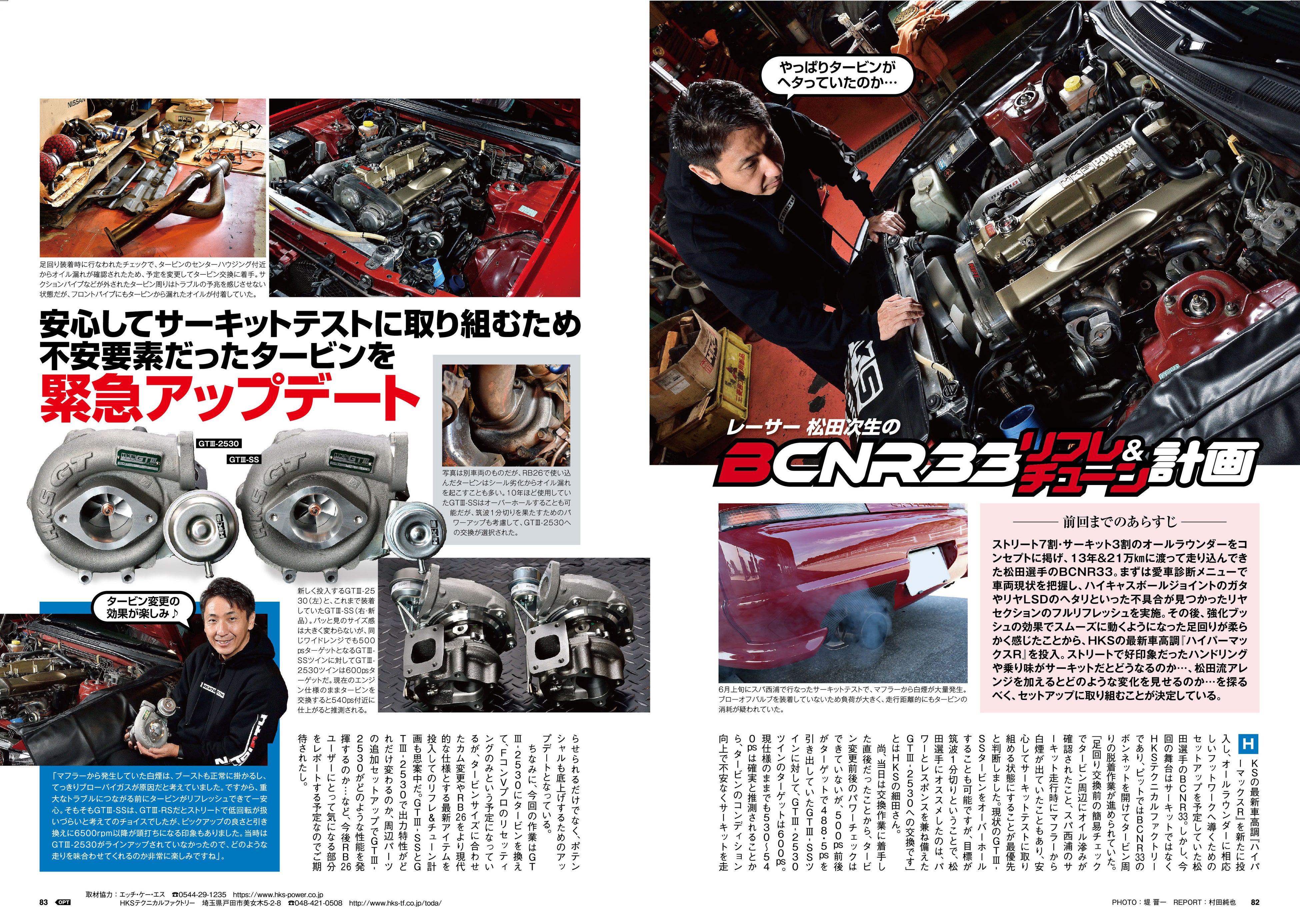 不定期連載でお届けしている松田次生選手の愛機、BCNR33のリフレッシュ&チューニング企画。今回は装着したHKS最新の車高調『ハイパーマックスR』をテストする予定だったが、事前のチェックやテスト走行で不安要素とされていたタービンのアップデートに着手することに…。筑波1分切りの足掛かりとなるか!?