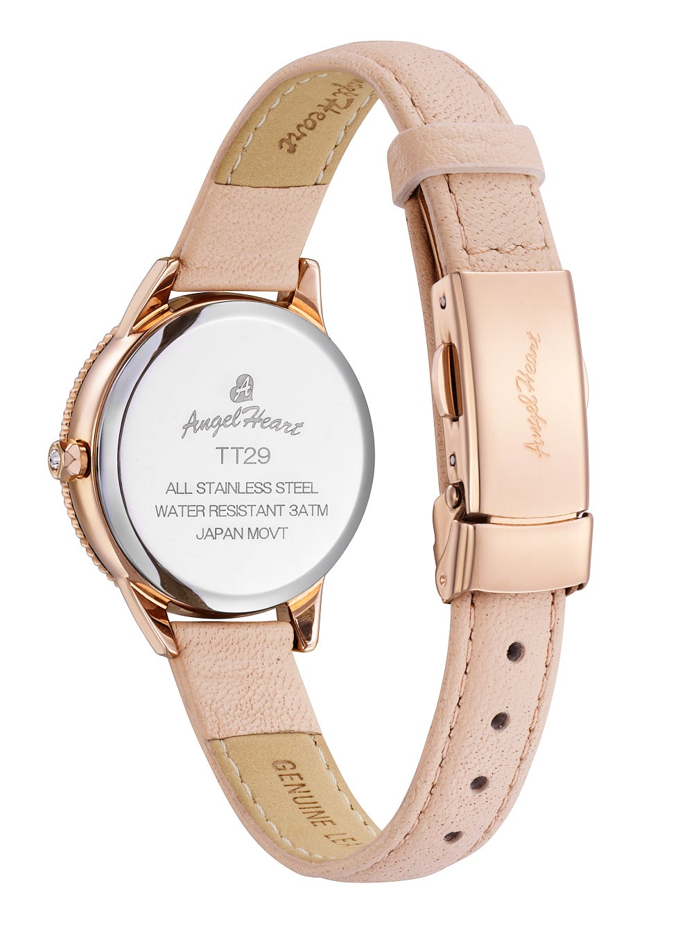 | ●デザインPoint ①Angel Heart初となる月の満ち欠けを表すムーンフェイズを搭載。 パール文字盤と相まって、煌びやかな夜空を連想させる1本です。 ②宝石のようにカットされたリューズもポイント。 ③文字盤の天然パールは光の当たり具合で七色に輝き、様々な表情を楽しめます。 ●機能Point ①TT29P-PKのレザーベルトモデルにはDバックル付きベルトが。 片手で着脱可能となり、また革ベルトへの負荷が軽減するため、より長く便利にご着用いただけます。 ②傷がつきにくい上質なサファイアガラスを使用。デザイン性だけでなく、機能面も考えられています ●スペック情報 サファイアガラス/3気圧防水 /パールダイヤル/クリスタル/プッシュ式バックル(T29PG)/Dバックル(TT29P-PK)/ステンレススチール(TT29PG)/カーフレザー(TT29P-PK)/ケースサイズW29㎜×H29㎜/ムーンフェイズ  |