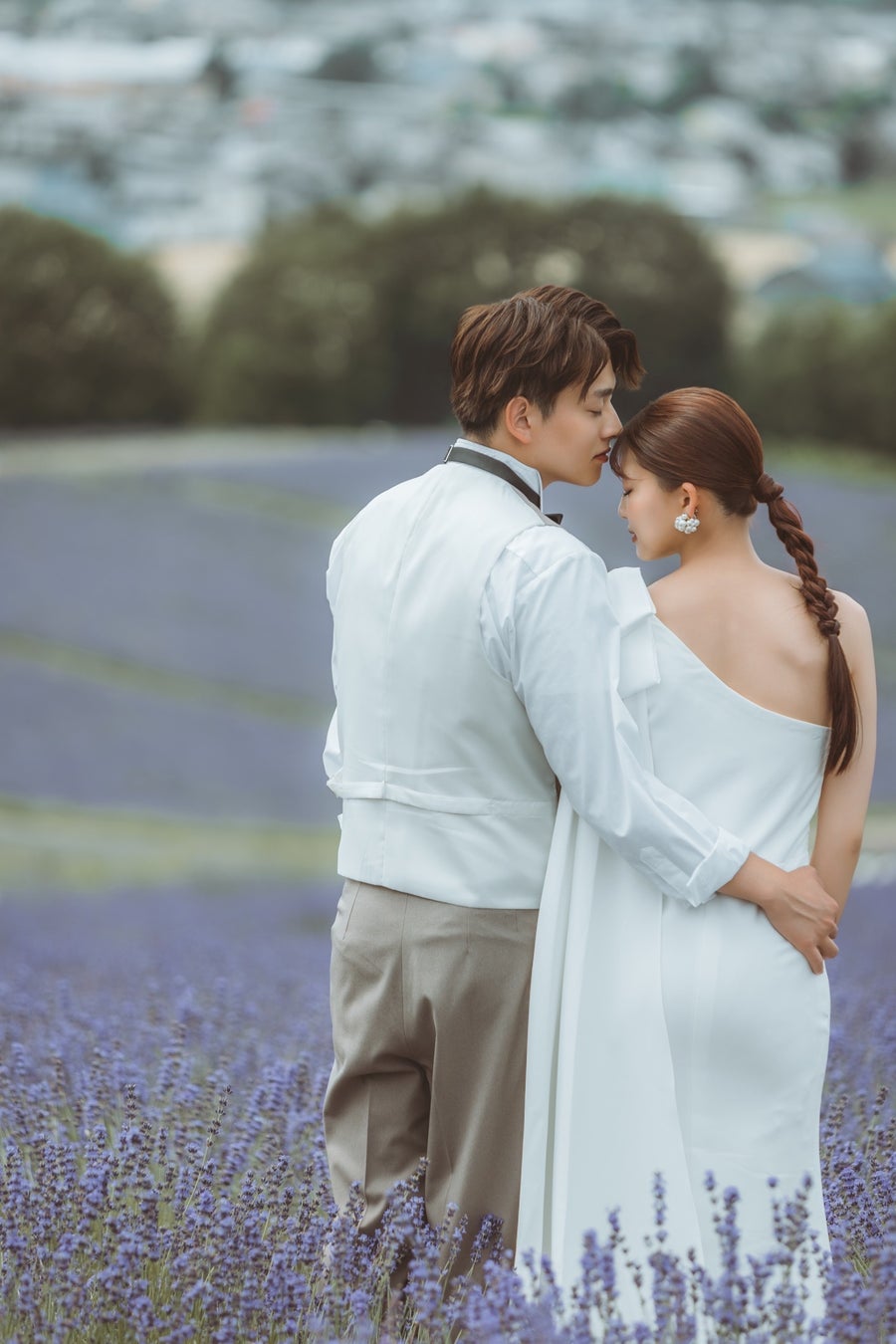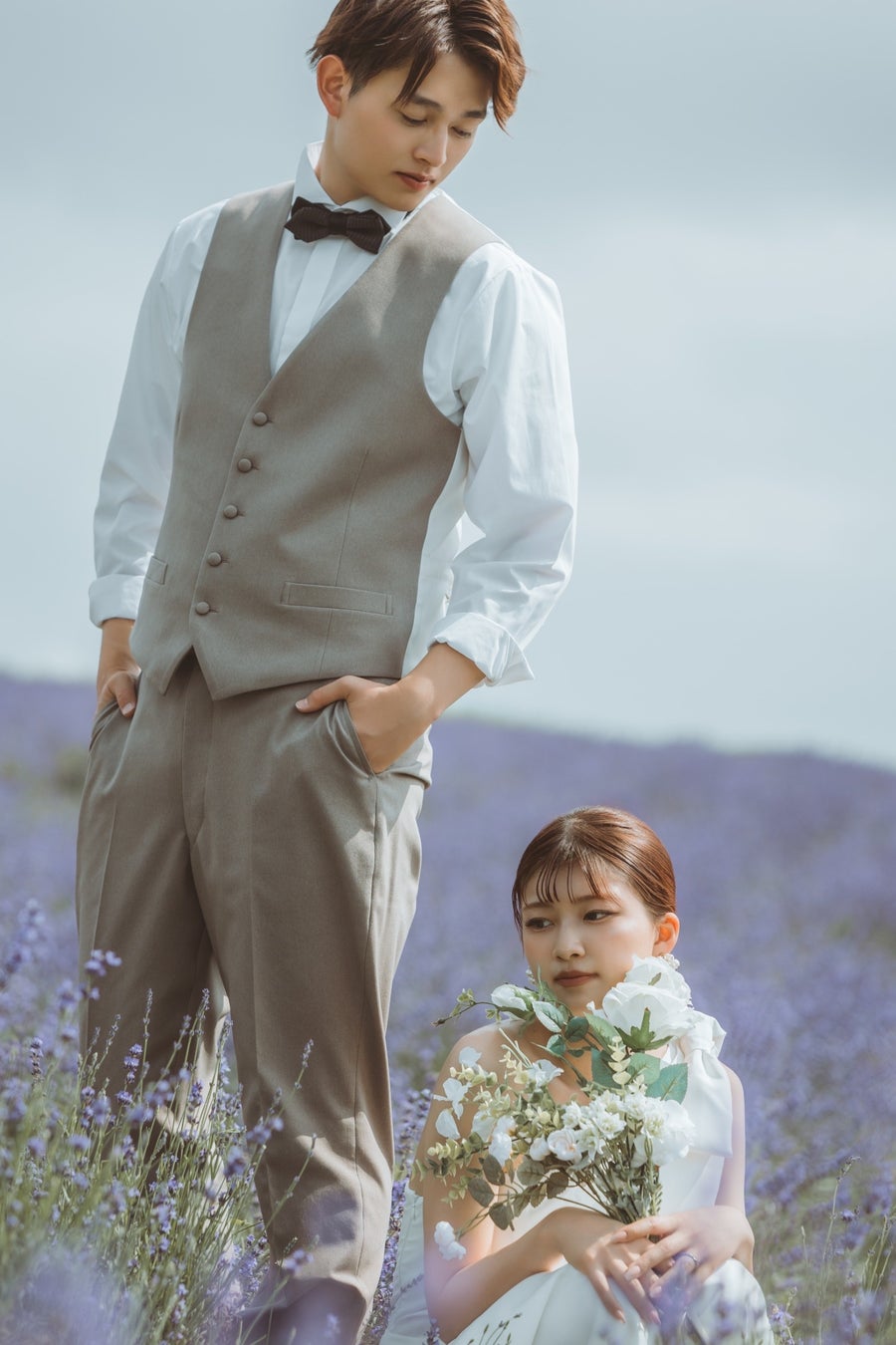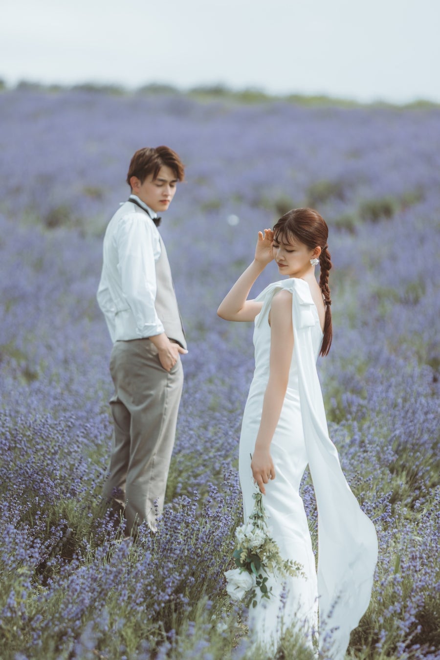 タイトにまとめたスタイルで洗練されたドレススタイルと絶妙に調和しており、全体の雰囲気に柔らかく優雅な印象を添えています。ナチュラルな美しさを引き立てつつ、ラベンダー畑のロマンチックな景色とも見事にマッチしていて、まるで映画のワンシーンのような演出に。