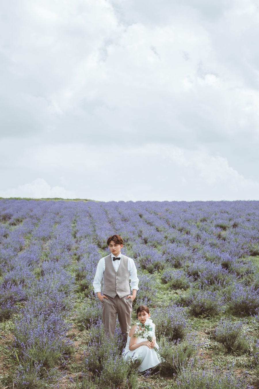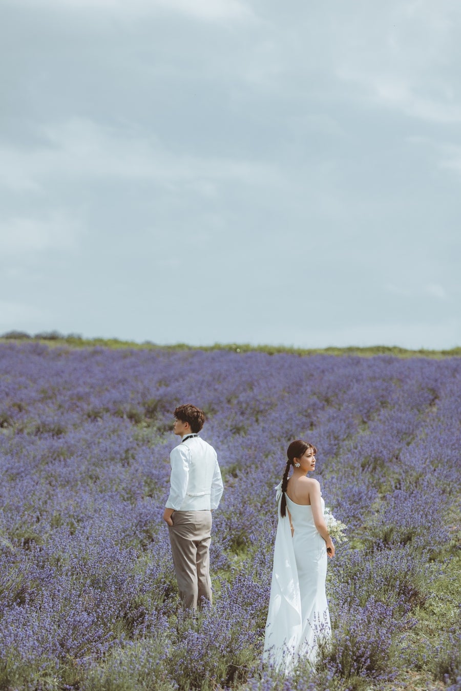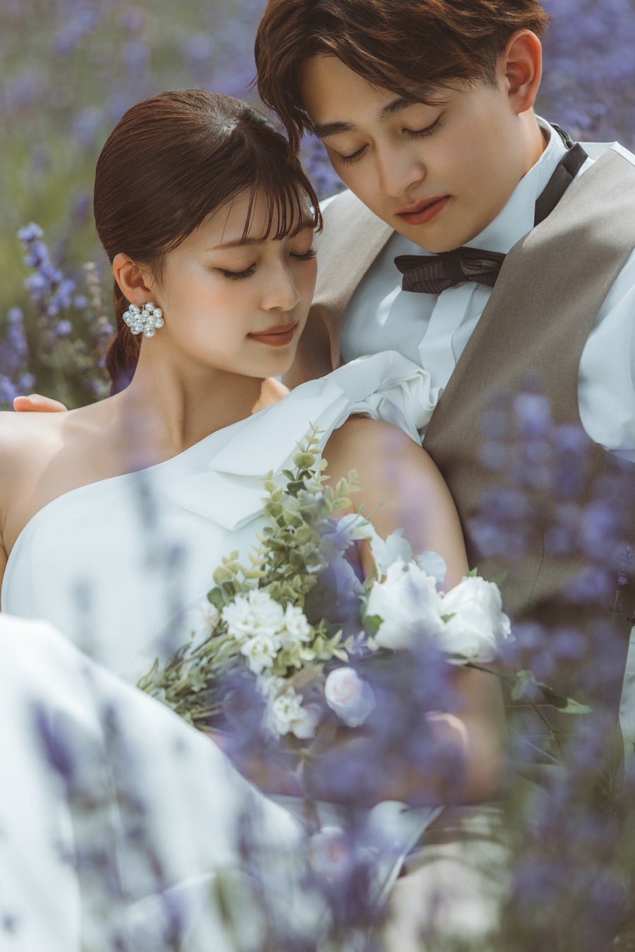 タイトにまとめたスタイルで洗練されたドレススタイルと絶妙に調和しており、全体の雰囲気に柔らかく優雅な印象を添えています。ナチュラルな美しさを引き立てつつ、ラベンダー畑のロマンチックな景色とも見事にマッチしていて、まるで映画のワンシーンのような演出に。