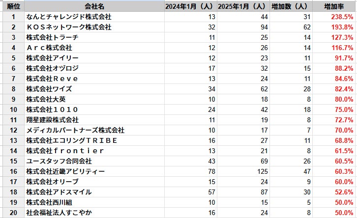 ・2024年1月時点と2025年1月時点の従業員数を比較