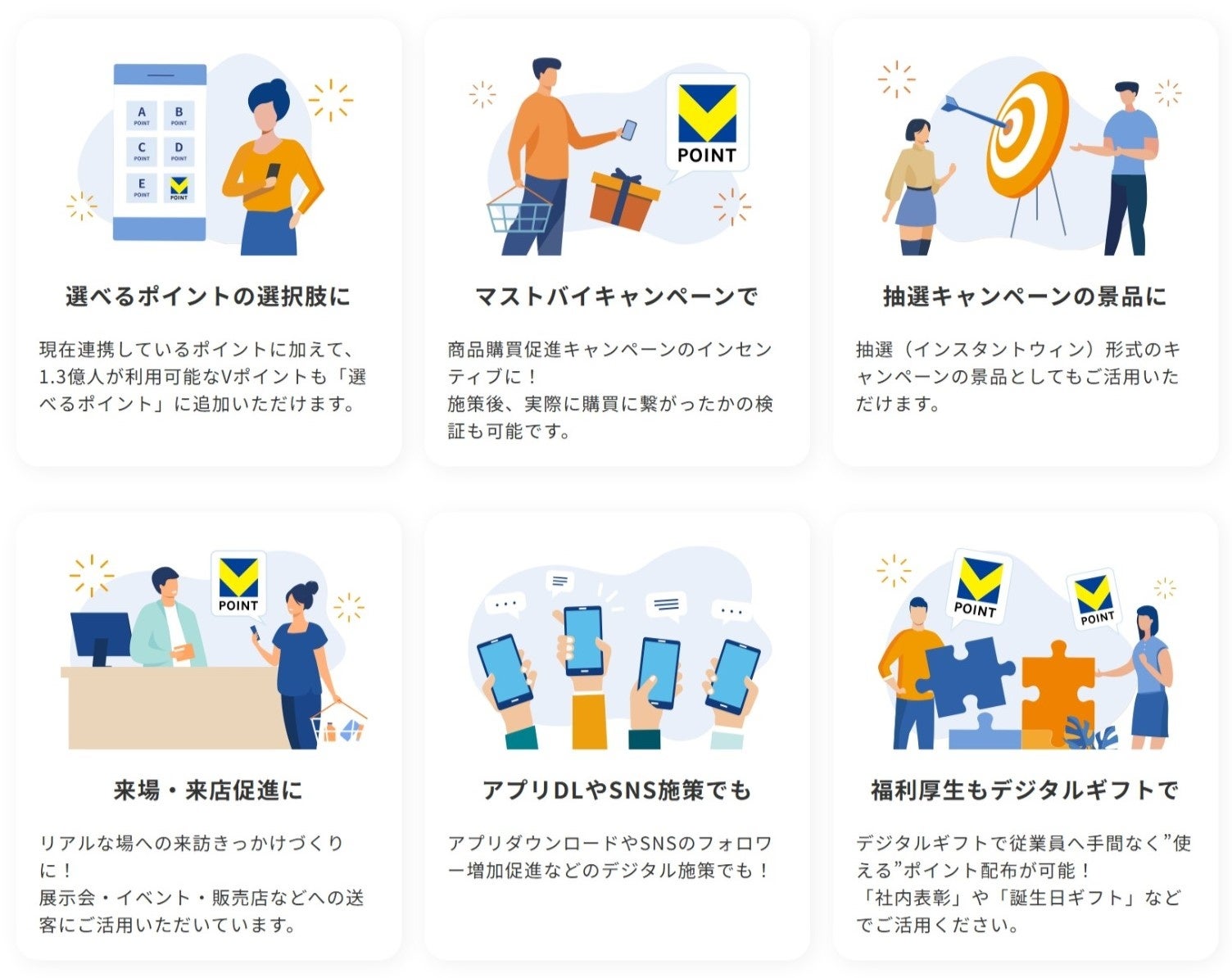 Vポイントは、1.54億人(有効ID数)が利用する共通ポイントサービスです。貯まったポイントは全国16万店舗のVポイント提携先に加え、国内約750万店舗、世界約1億店舗のVisa加盟店(※1)で1ポイント=1円分として使うことができます。「Vポイントギフト」は、施策ごとに単発でご利用いただくことができ、商品の販促キャンペーンやアンケートの御礼、ポイント交換や景品、福利厚生や株主優待など、幅広い用途でご活用いただけます。さまざま場所で貯まり、使える共通ポイントだからこそ、Vポイントを活用することで、お客さまに喜んでいただける仕組みが生まれます。