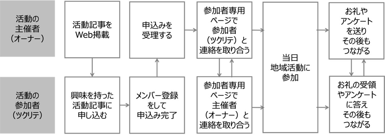 「ツクリテ」は、地域ファンづくりのためのWebプラットフォームです。まちで企画を立ち上げる主催者と、興味関心に応じて体験に参加する参加者をシームレスにつなぎ、“楽しみごと”を共に創り、