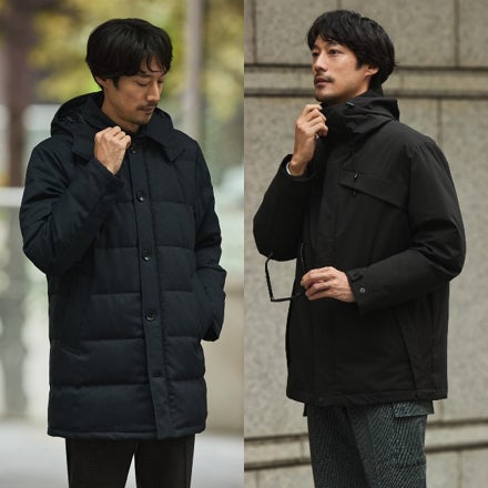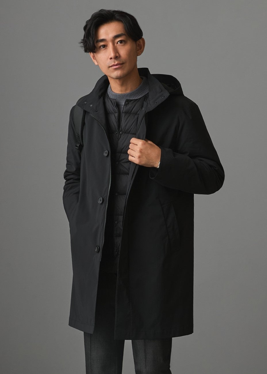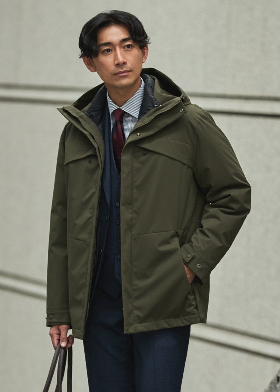 表地はマットな質感でハリのある合繊素材を採用。雨や雪にも安心な撥水機能を備えるとともに、前立て比翼仕様のため風の侵入を防ぎ、保温性にも優れています。また、スーツやジャケパンスタイルの上から羽織ってもジャケットの裾がしっかり隠れる着丈設定のため、ビジネスシーンに相応しいスマートな身だしなみを実現。フードやウエスト部分に配したドローコードで絞りを調整することで、シーンに合わせてメリハリのあるシルエットをお楽しみいただけます。