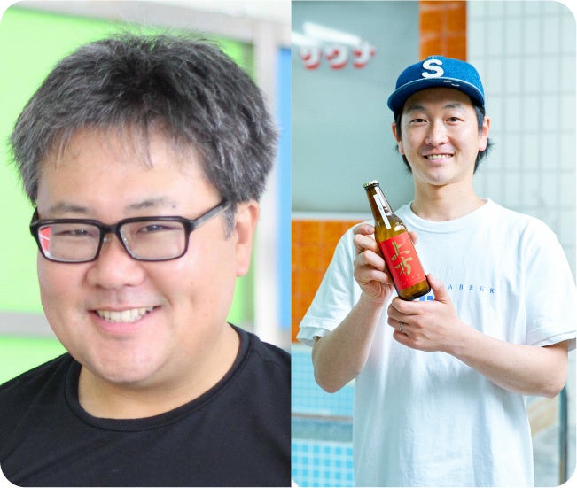 銭湯ブルワリー「上方ビール」志方昂司さんと、銭湯の番頭「都湯」はらとしきさん。