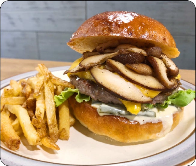 「RISE&WIN」がある徳島県上勝町特産のシイタケを使ったオリジナルハンバーガーは、サウナービールと相性ぴったり。
