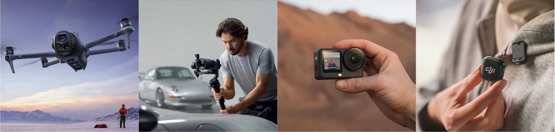 ドローン:Mavic 4 Pro、Air 3S、Mini 5 Pro、Neo 2、 スタビライザー:RS 5、RS 4 Mini、 ハンドヘルド:Osmo Action 6、Osmo 360、Osmo Nano、Mobile 8 マイク:DJI Mic 3 ほか |