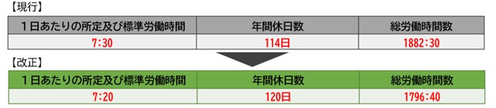 事業運営体制の改正を踏まえ、職種ごとに異なっていた労働時間・休日数を統一のうえ、年間の所定労働時間を短縮します。