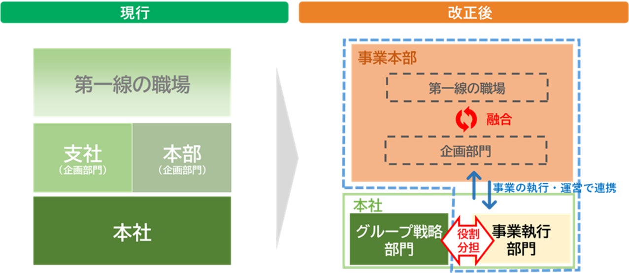 第一線の職場、本部・支社、本社の3層の組織構造から、本部・支社を無くし、第一線の職場と本部・支社を融合した事業本部と本社の2層構造とし、事業本部がそれぞれの管轄エリアの経営の基本単位となります。これにより、これまでの現業・非現業という働き方の「当たり前」を超えていきます。