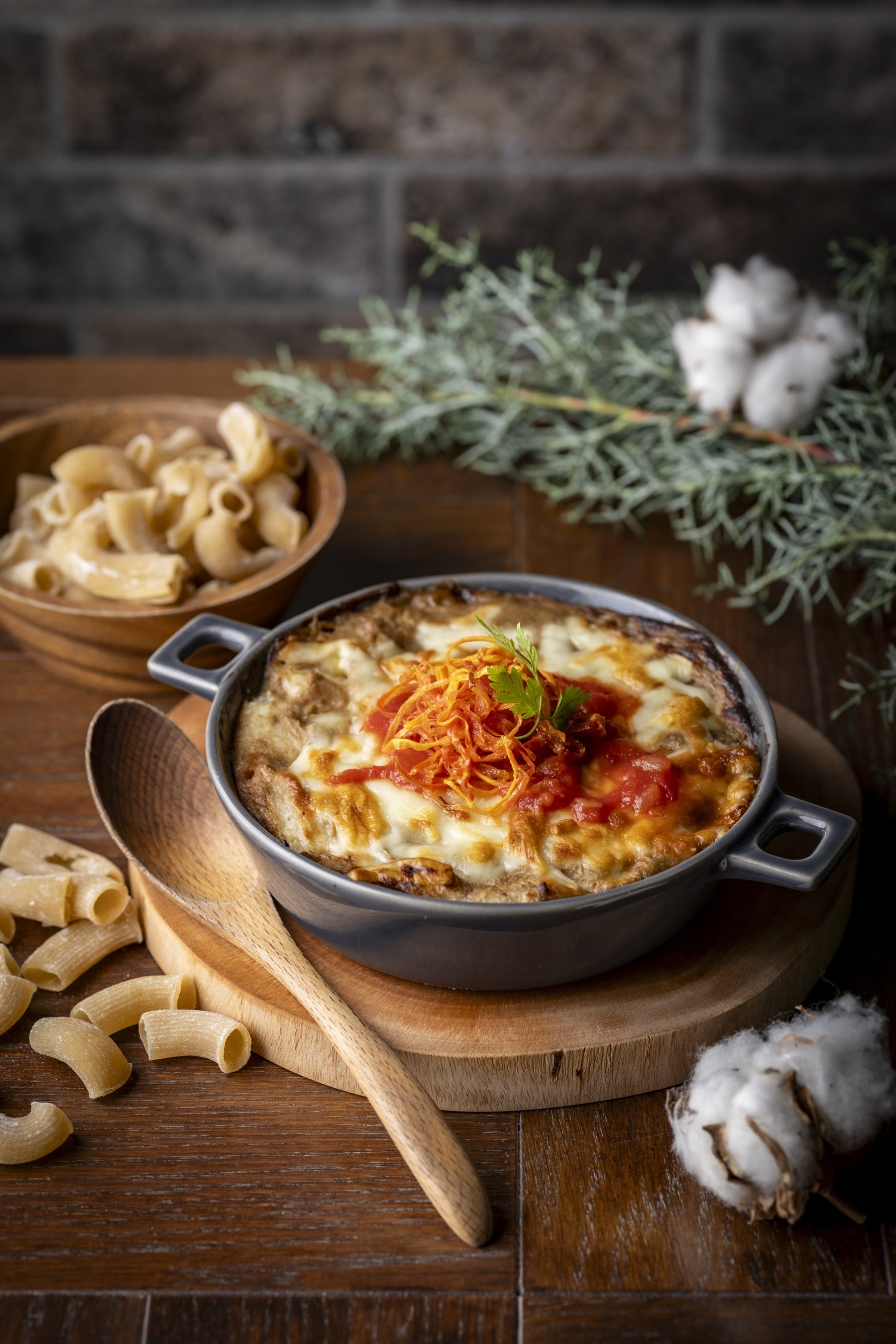 前菜プレート(FANCLケールジュース、日替わり前菜2種、季節のスープ)に加え、BRMで展開している玄米パスタ(リガトーニ)を使用した冬限定のグラタンセットです。大豆ミートを使ったミートソースにライスチーズを使用し、コクのあるグラタンに仕上げました。グルテンフリー・ヴィーガン・ベジタリアンの方にお勧めな、寒い冬にぴったりのメニューです。