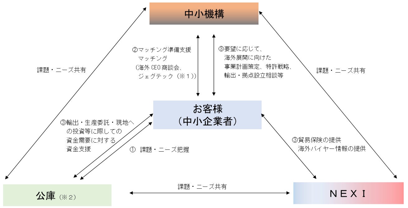 中小機構、NEXI、日本公庫が、様々なメニューの中から、中小企業の海外販路拡大のために特に有用な支援策に絞って持ち寄ることで、中小企業の海外販路拡大に関する課題やニーズの把握から、ビジネスマッチング支援、事業計画策定支援、金融支援、リスク対応等を、3者一体となって、切れ目なく実施します。