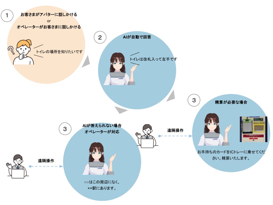 ③AIが答えられない場合や精算が必要な場合に、遠隔操作でオペレーター(駅係員)がアバターを通じて質問の回答や精算処理など対応する