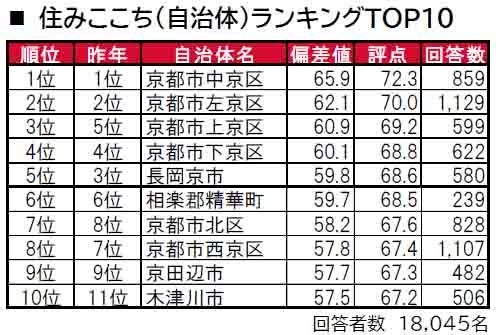1位は、5年連続で京都市中京区です。2位は、4年連続で京都市左京区です。3位は京都市上京区で、昨年5位から順位を上げました。トップ4は全て京都市の行政区、またトップ10のうち6つが京都市の行政区という結果になっています。