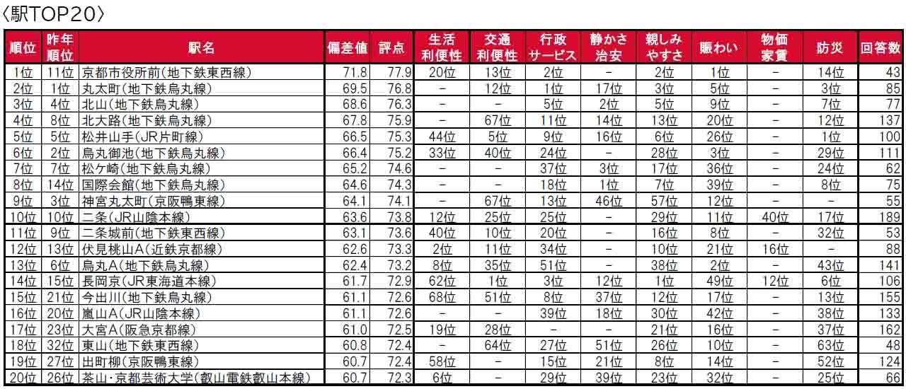 1位は京都市中京区に位置する京都市役所前(地下鉄東西線)で、昨年11位から大きく順位を上げ、唯一偏差値70台の高い評価を得ています。2位は、京都市中京区に位置する丸太町(地下鉄烏丸線)です。3位は、京都市左京区に位置する北山(地下鉄烏丸線)です。トップ10内では、京都市左京区に位置する国際会館(地下鉄烏丸線)が昨年14位から順位を上げて8位となっています。トップ10の駅のうち、6駅が地下鉄烏丸線沿線の駅です。