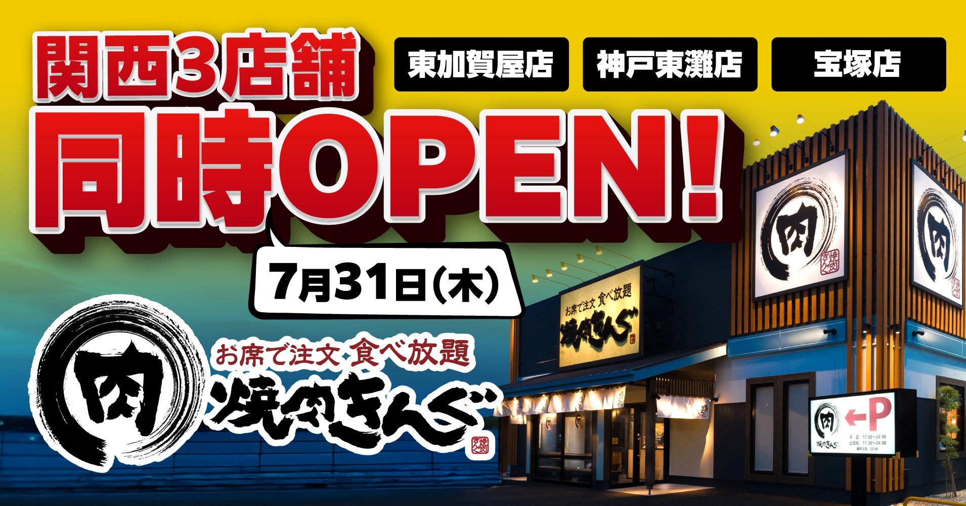 【焼肉きんぐ】7月31日(木)に関西3店舗(東加賀屋店・ 神戸東灘店・宝塚店)が同時グランドオープン!