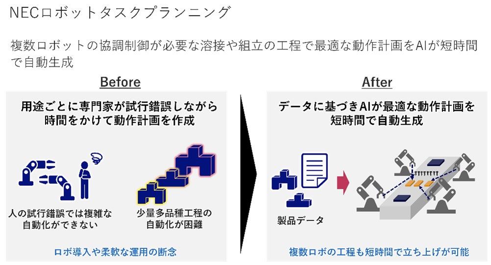 従来、複数ロボットを協調させる動作プランの作成は、熟練技術者がティーチングという作業により人手で行っていました。この作業は非常に難易度が高く、製造現場では一つの製品を製造するロボットの動作プランを設計するだけでも多大なコストを要するため、複数ロボットを活用した生産ライン立ち上げのボトルネックとなっていました。