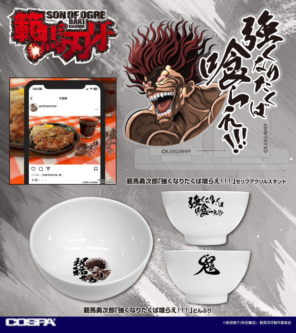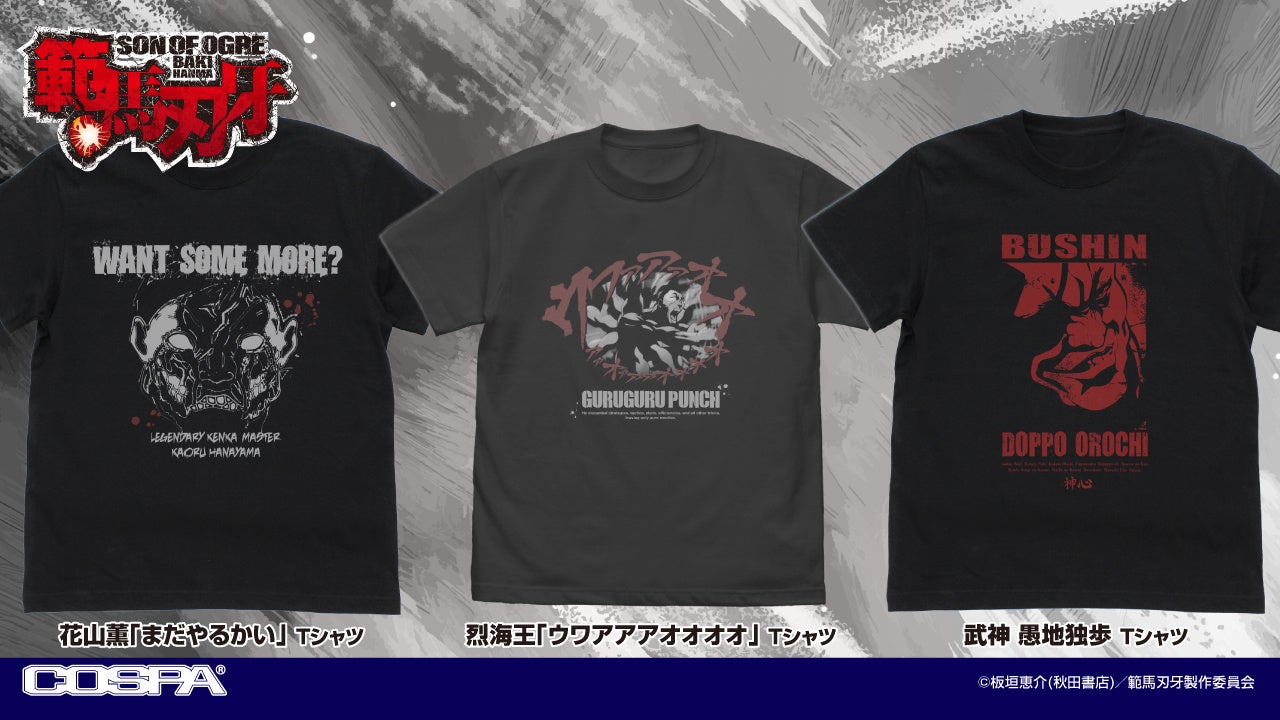 「強くなりたくば喰らえ!!!」TVアニメ「範馬刃牙」より、印象的な名シーンの「Tシャツ」や「アクリルスタンド」が登場だッッ!【株式会社コスパ】