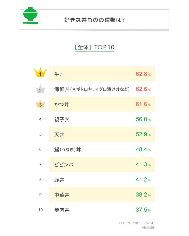 【LINEリサーチ】好きな丼ものの種類TOP3は「牛丼」「海鮮丼」「かつ丼」!