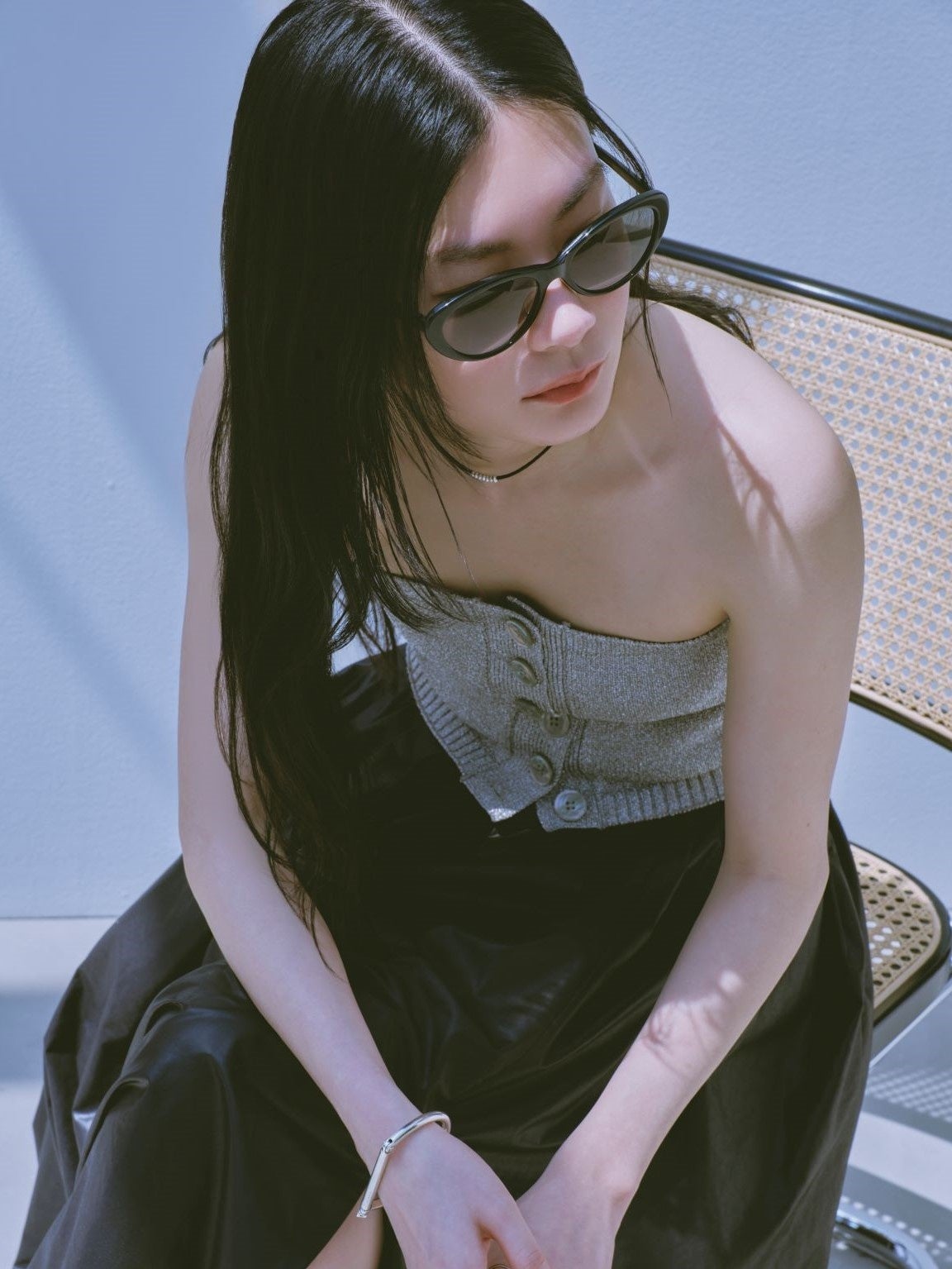 lame knit bustier ¥13,200 sideslit volume skirt ¥22,000(共に税込み)