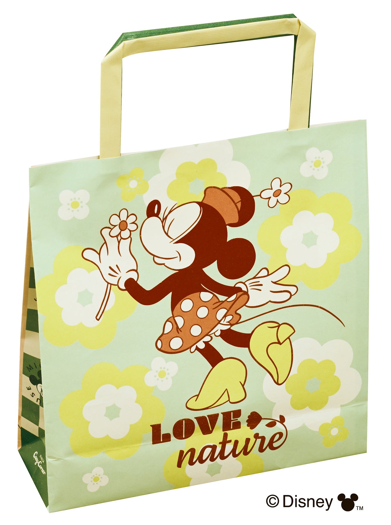 バッグは、くすみカラーをベースに花の香りを楽しむミッキーマウスとミニーマウスを片面ずつにデザイン。持ち手もバッグのデザインに合わせたカラーにするなど、細部までこだわりました。