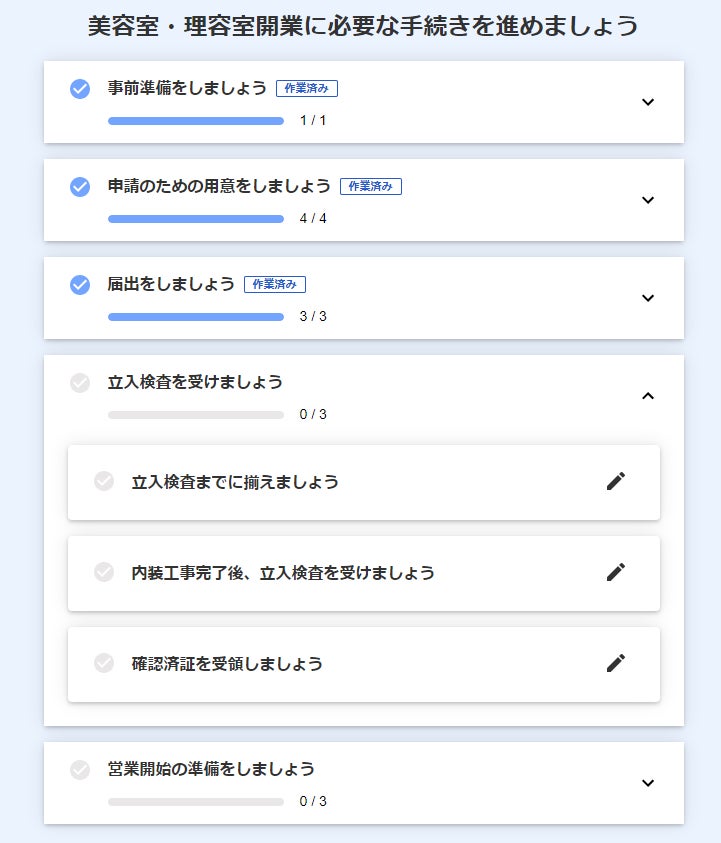 「freee許認可 美容室・理容室開業」では、いつまでに何をしなければならないか、開業スケジュールに応じて必要な手順をわかりやすくステップ化し、余計な時間や手間をかけずに届出・開業ができるようになりました。今後、美容室・理容室開業にかかわる機能を随時アップデート予定です。