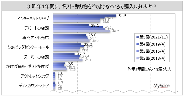 ■昨年1年間に贈ったギフトの購入場所は、「インターネットショップ」が贈った人の5割強、「デパートの店頭」「専門店・小売店」「ショッピングセンター・モール」が各20%台