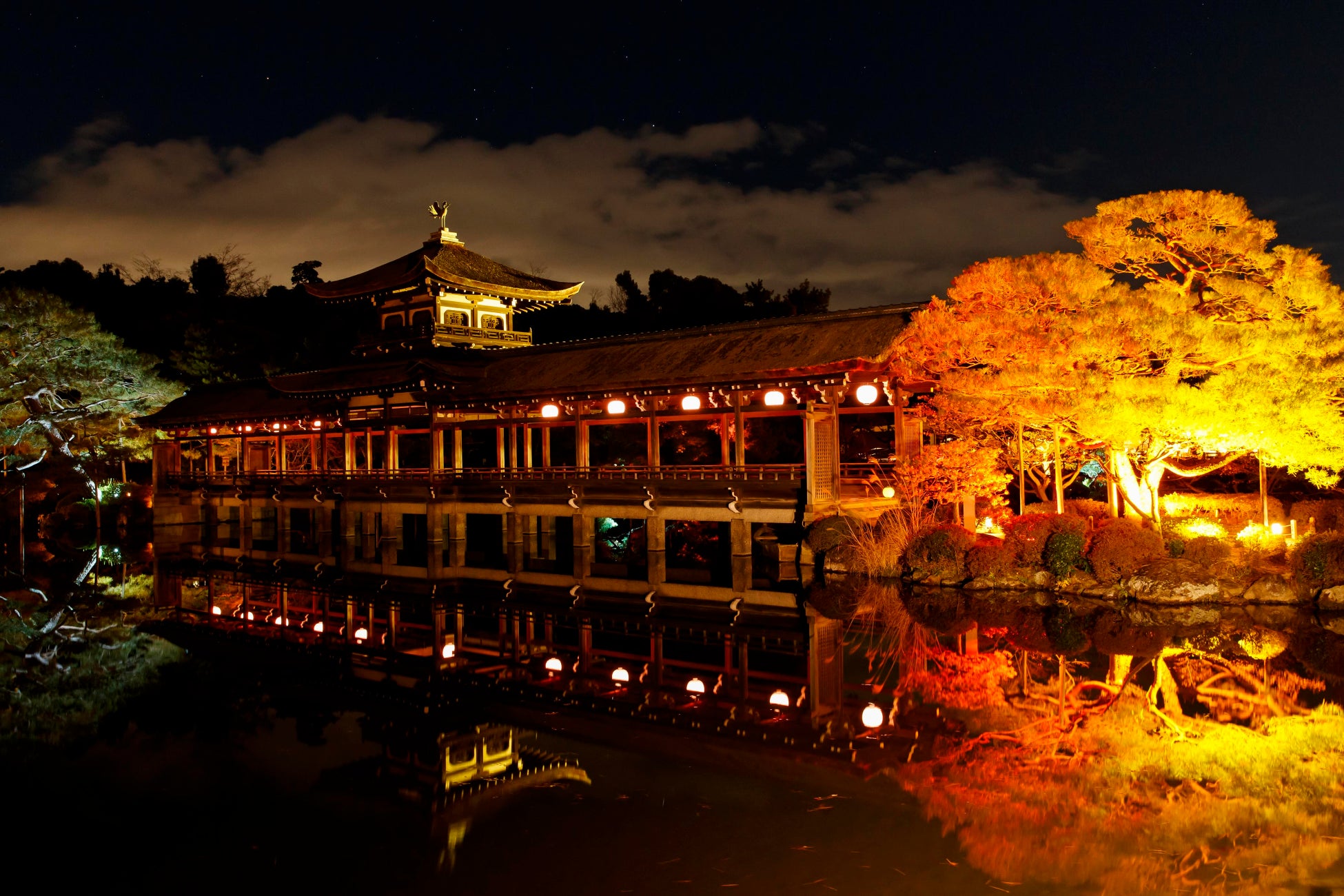 平安京の正庁朝堂院を再現した壮麗な建築。幻想的な光に包まれた大極殿の前で、祈りの時間を。