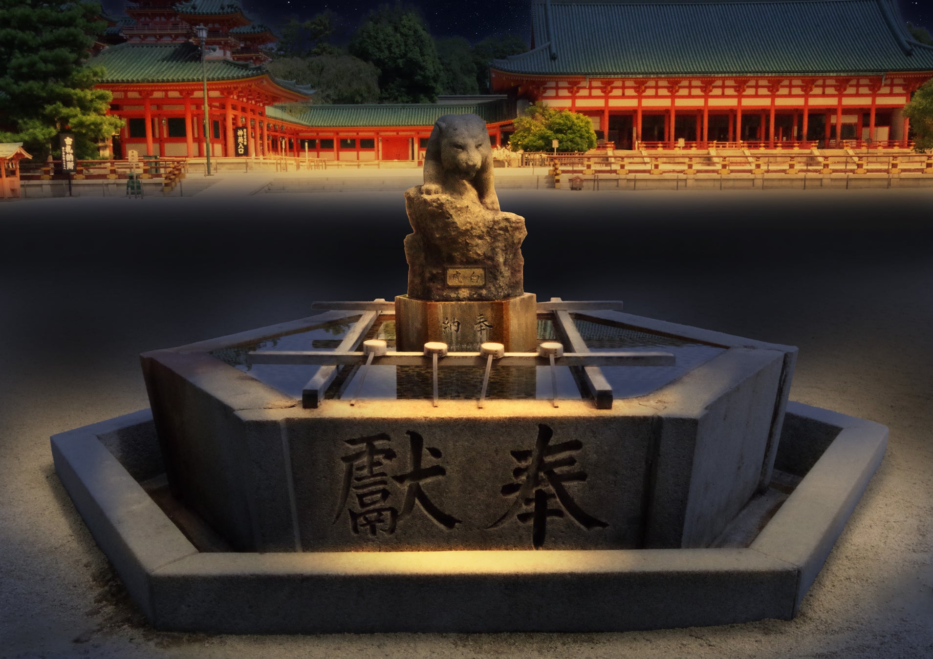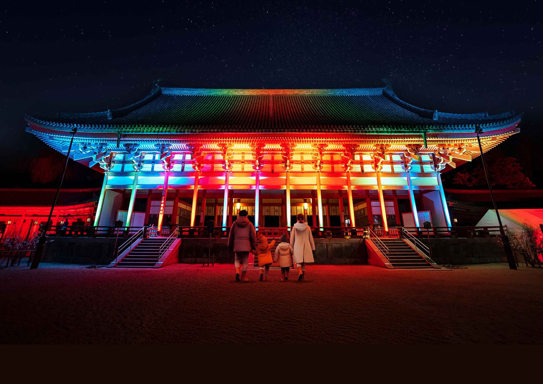光る提灯の光を大極殿へと送り、四神への祈りを届ける体験。壮麗な社殿が静かに呼応します。