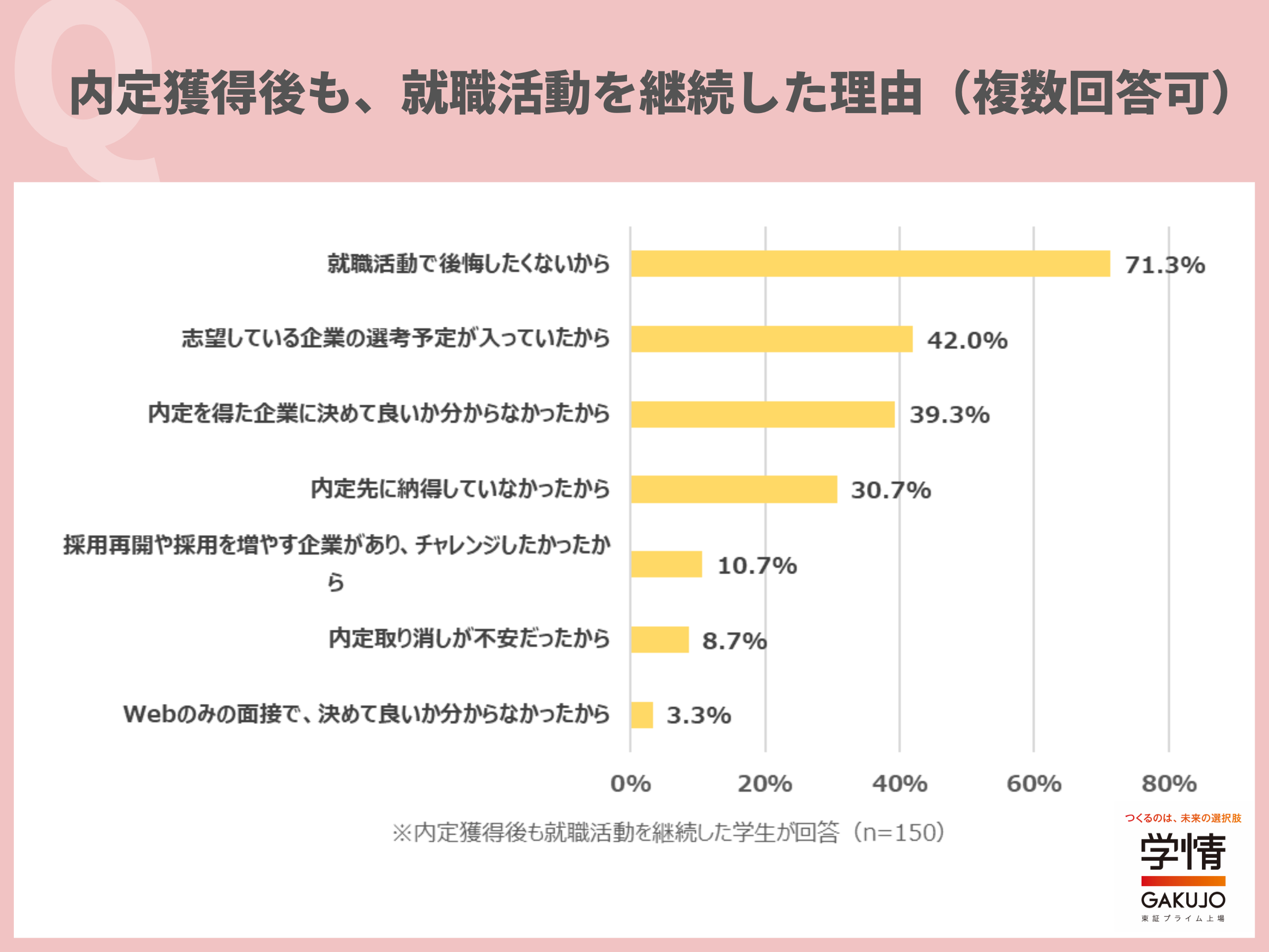 内定獲得後も就職活動を継続した理由は、「就職活動で後悔したくないから」が71.3%で最多。次いで、「志望している企業の選考予定が入っていたから」が42.0%、「内定を得た企業に決めて良いか分からなかったから」39.3%が続きました。