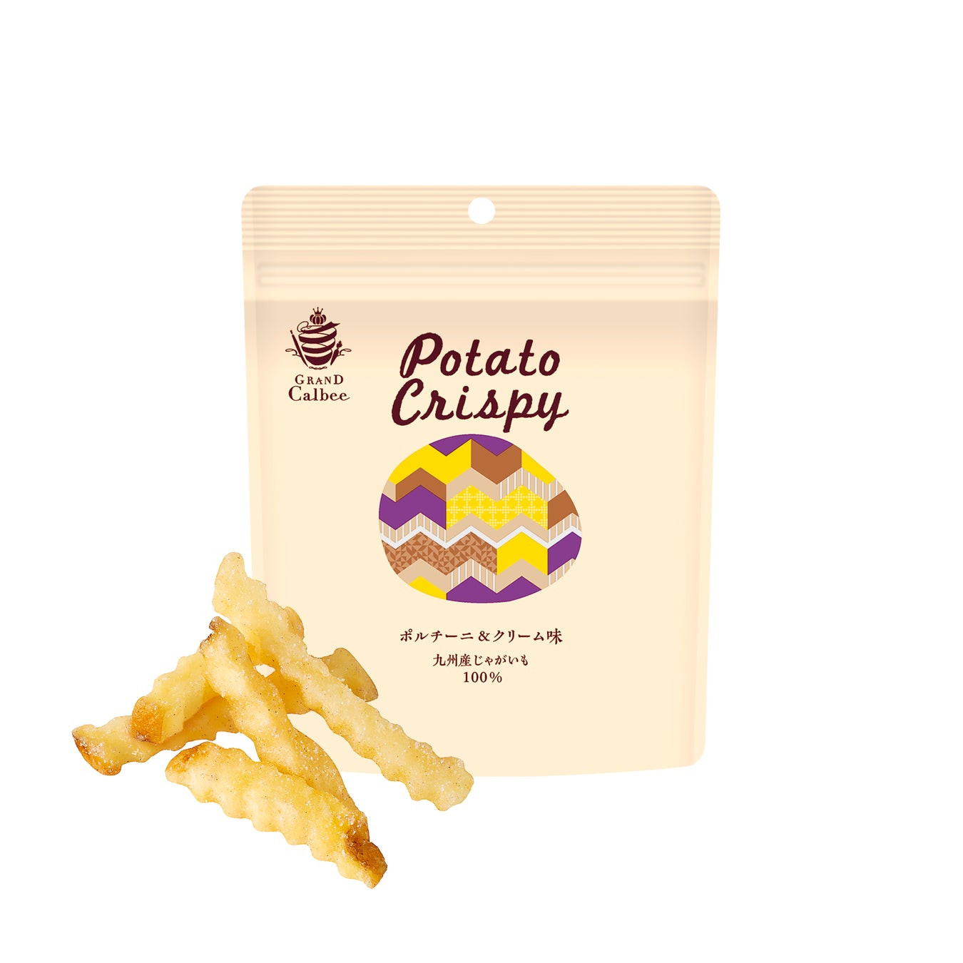 ●『PotatoCrispy ポルチーニ&クリーム味』は、九州産じゃがいもを100%使用し、波型スティックカットで軽い食感を追求。ポルチーニの旨みとコク深いクリーミーな味わいで、まるでフライドポテトを食べているかのような濃厚な味わいが楽しめる商品です。