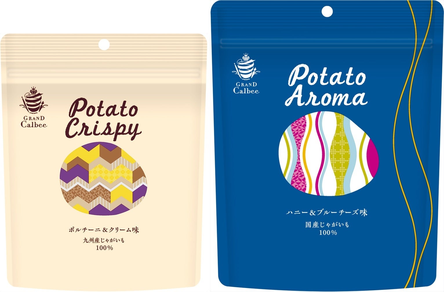 グランカルビーに新商品が2品登場!『PotatoCrispy ポルチーニ&クリーム味/PotatoAroma ハニー&ブルーチーズ味』