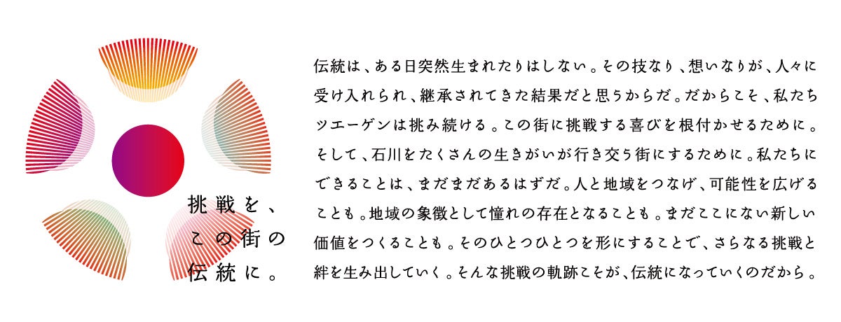 ツエーゲン金沢のクラブ理念である「挑戦を、この街の伝統に。」も、「挑戦する心・挑戦を応援する心」を、それが伝統になるように「進化し続けながら未来へと繋げていこう」という思いが込められています。