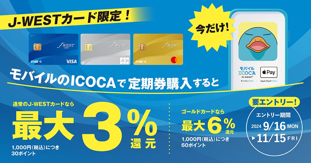 2024年9月16日~ J-WESTカード モバイルのICOCAで定期券購入キャンペーン