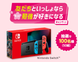 また、新学期に向けてお友達・ごきょうだいと一緒に「進研ゼミ」を始められる方を応援する「友だちといっしょなら、もっと勉強が好きになる」キャンペーンも実施中です。「お友達・ごきょうだい紹介制度」で「進研ゼミ小学講座」または「進研ゼミ中学講座」にご入会いただくと、ご紹介者の方・ご入会者の方全員へのプレゼントに加え、さらに抽選で「Nintendo Switch™」などをプレゼントします。