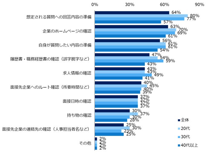 面接について不安に思うことを伺うと、最多は「想定外の質問に答えられるか」(55%)で、20代・30代は7割を超えました(20代:70%、30代:74%)。続けて、面接準備としてやっておいたほうが良いと思うことを質問しました。上位は「想定される質問への回答内容の準備」(64%)、「企業のホームページの確認」(63%)でした。これらの王道対策は面接を受ける上での“礼儀”や相手への“敬意”を示すためにも必要であるという声も寄せられました。具体的なコメントも紹介します。