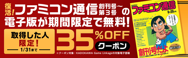 また、同電子書籍を取得してくれた方には『週刊ファミ通』を発行する「KADOKAWA Game Linkage」の作品に使える35%OFFのクーポンもプレゼントいたします。