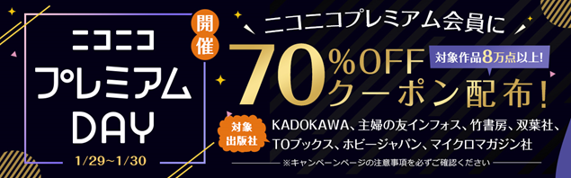 ニコニコプレミアム会員に、対象出版社7社(KADOKAWA、主婦の友インフォス、竹書房、双葉社、TOブックス、ホビージャパン、マイクロマガジン社)の8万点を超える対象作品の70%OFFクーポンを配布。お得なキャンペーンを実施いたしますのでぜひご期待ください!