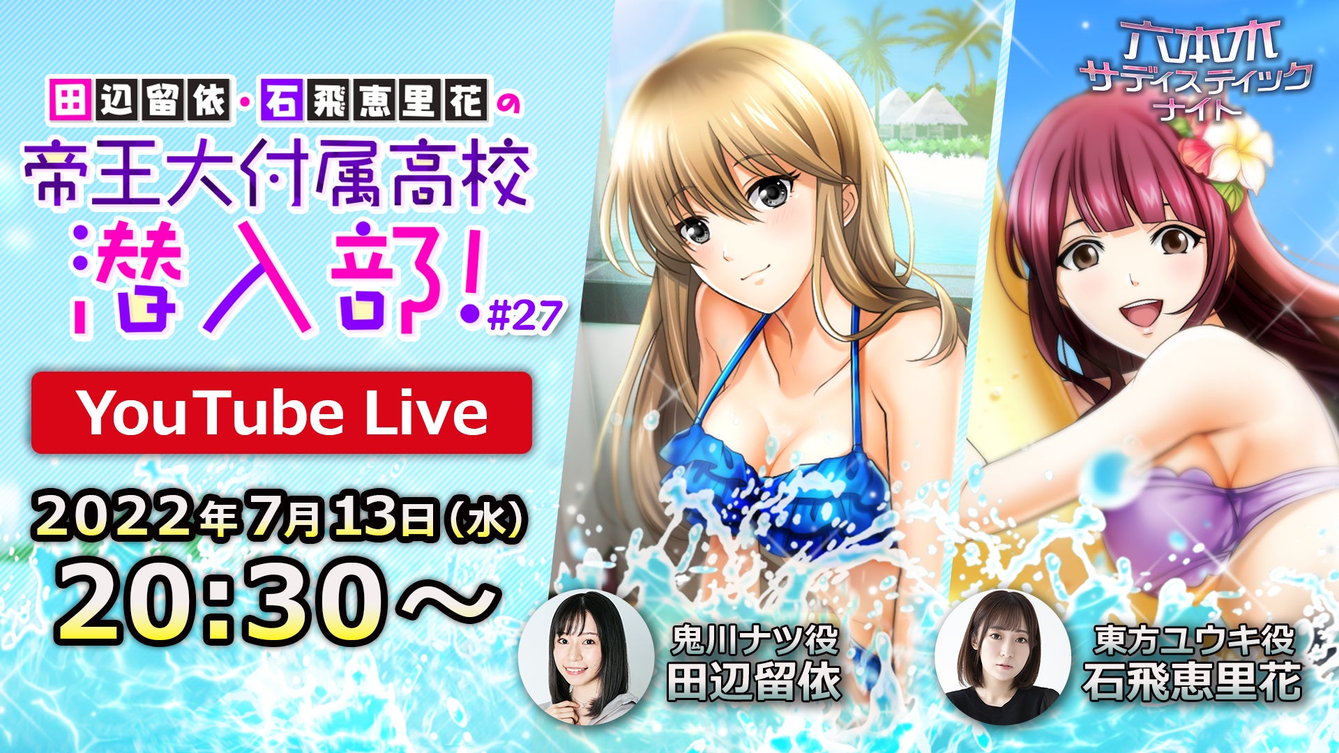 株式会社ボルテージ(本社:東京都渋谷区 代表取締役:津谷 祐司)は、現在配信中のカード型サスペンスアプリ「六本木サディスティックナイト」の公式YouTube番組「田辺留依・石飛恵里花の帝王大付属高校潜入部!#27」を7月13日(水)に生配信することをお知らせいたします。