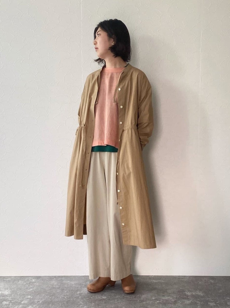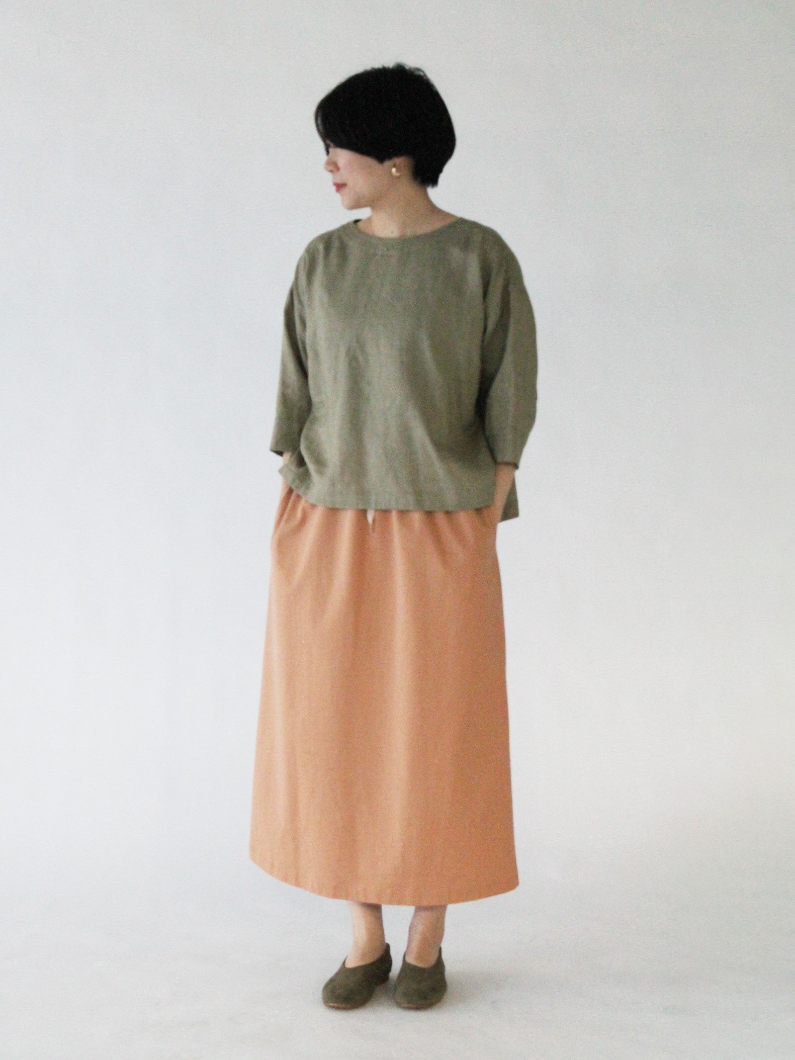 【6月】ジメジメとした梅雨時期には、リネン素材のブラウスが味方に。オレンジ×カーキが優しい表情を引き出してくれます。