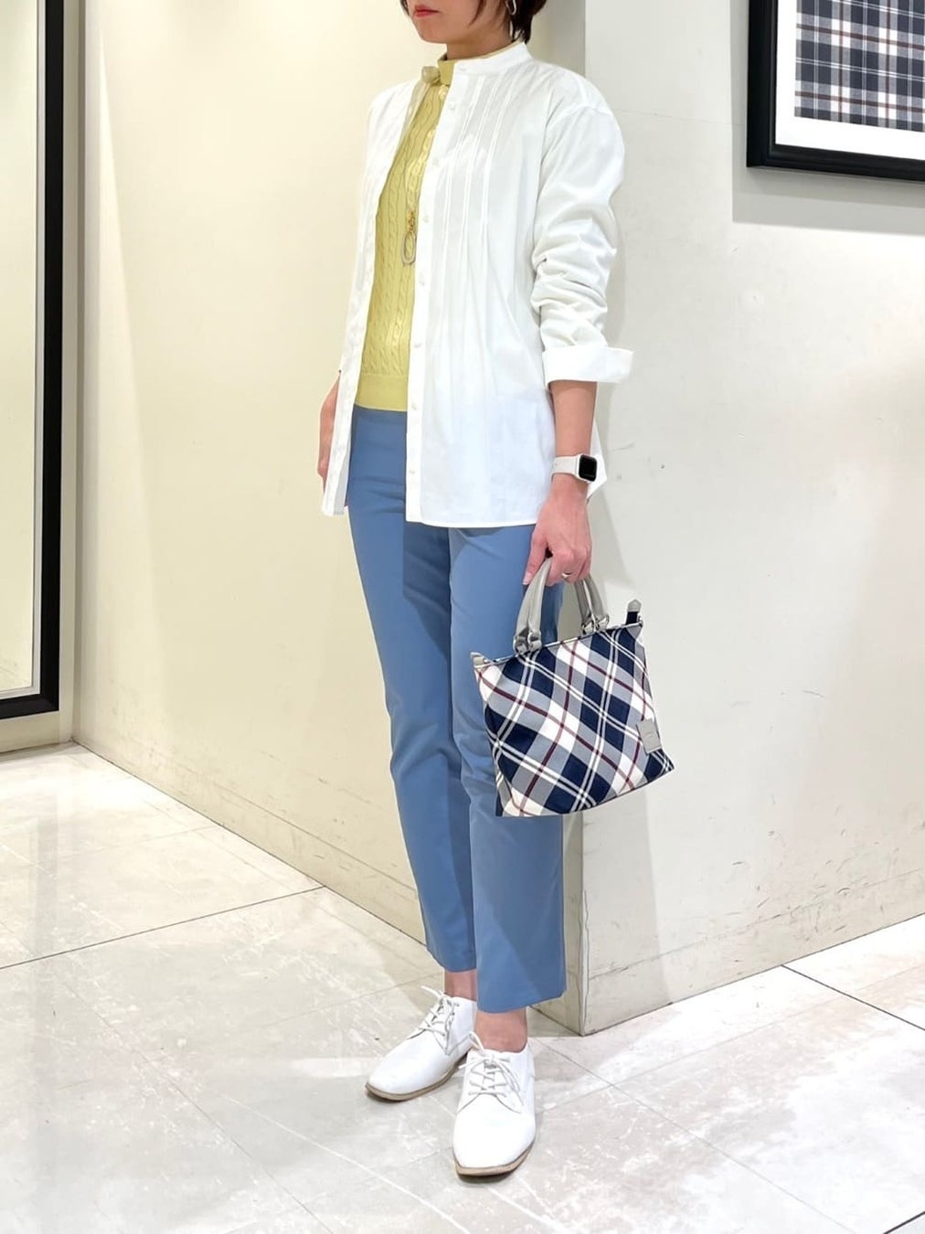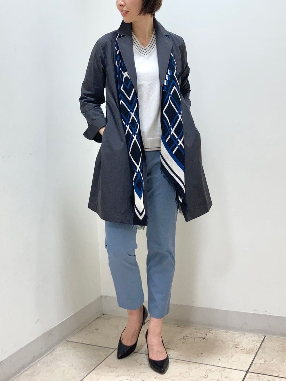 【4月】パンツのきれいな色を引き立たせるホワイト、ネイビーでコーディネート。襟元を彩るストールは、寒さ対策にも◎