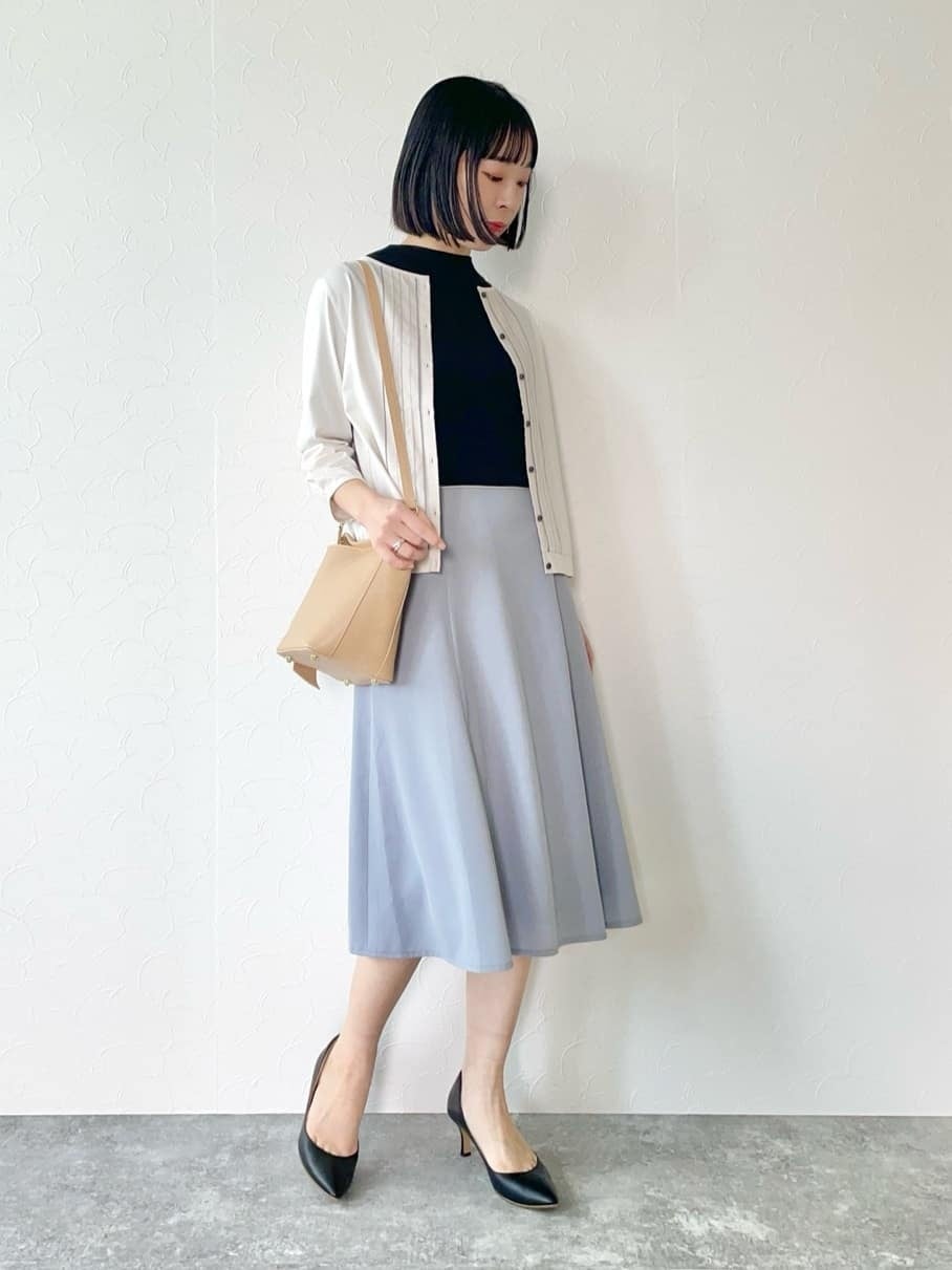 【5月】5分袖ニットとカーディガンの軽やかなレイヤード。モックネックのニットは、まだ肌寒い時期から長く活躍するアイテムです。