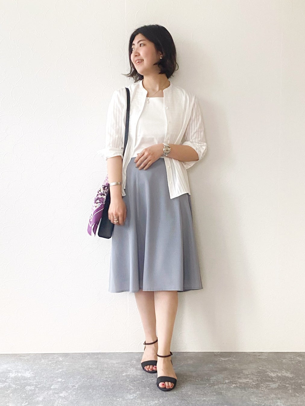 【6月】タンクトップにシャツを羽織って涼しげに。ホワイト×ホワイトのレイヤードが透明感を高めてくれるスタイリングです。