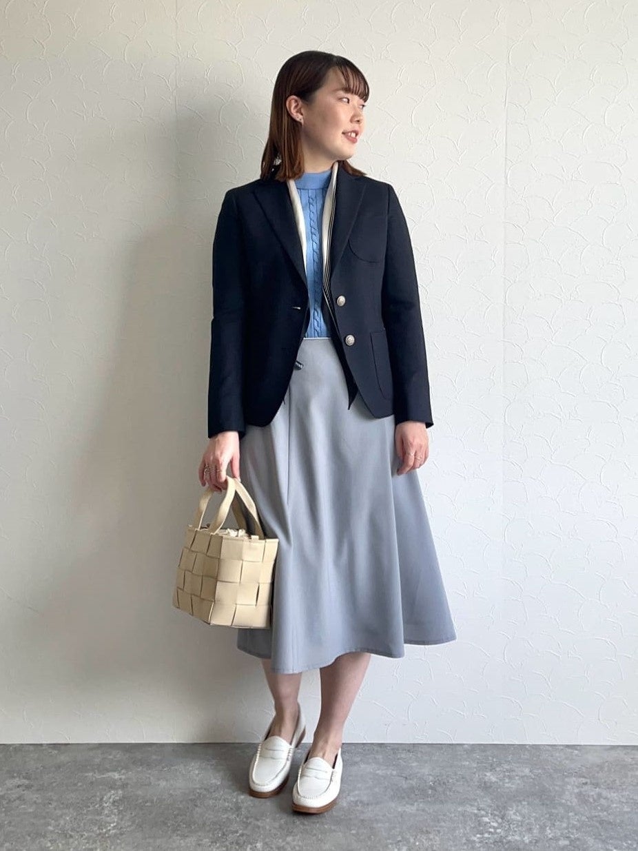 【4月】ネイビーブレザーを合わせて春のトラッドスタイルに。差し色にしたブルーのケーブルニットが、爽やかさをプラスしてくれます。