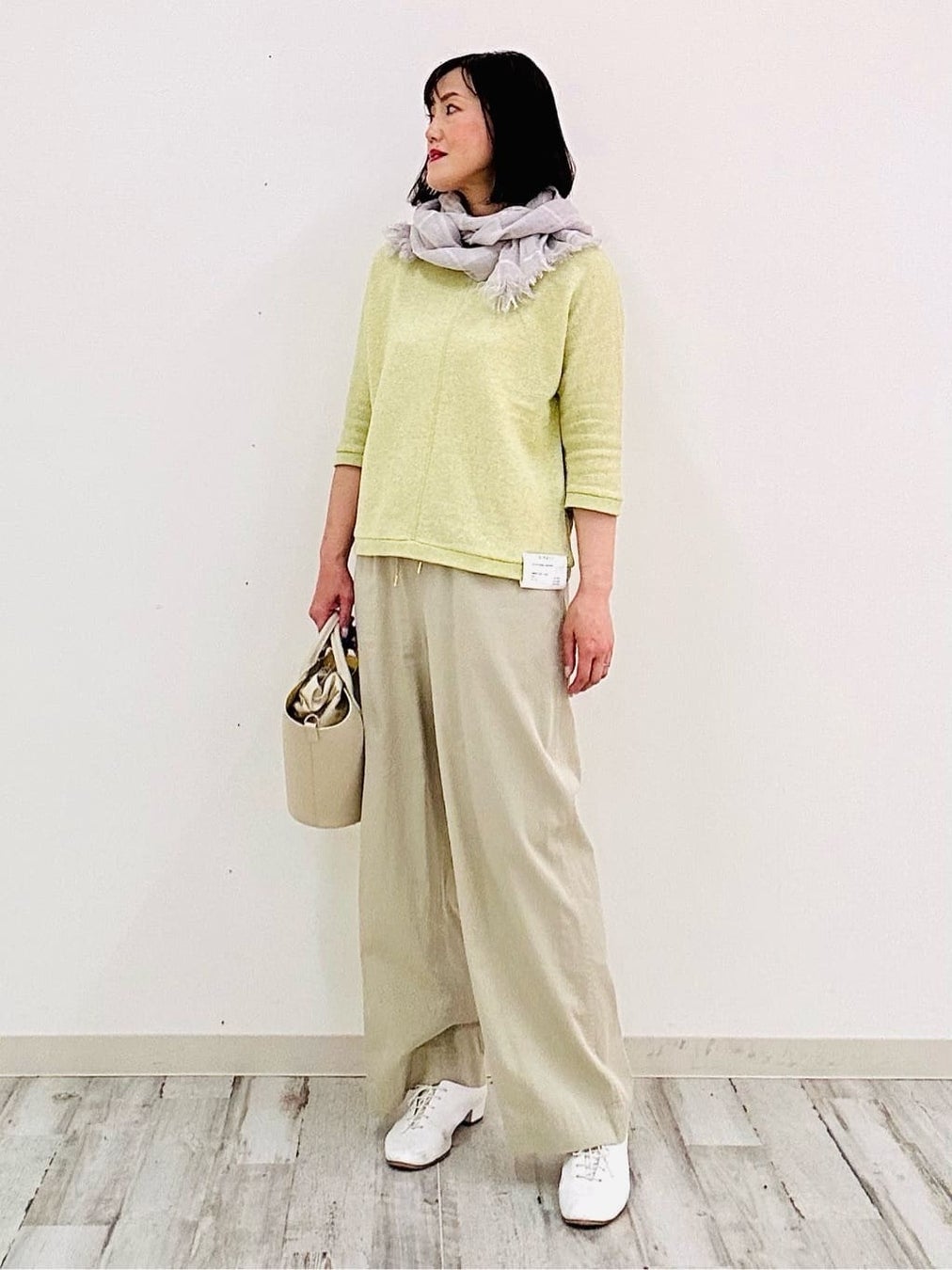 【5月】ドルマンニットを合わせてリラックス。麻混のストールをプラスすれば、爽やかさをキープしながら寒暖差にも対応。