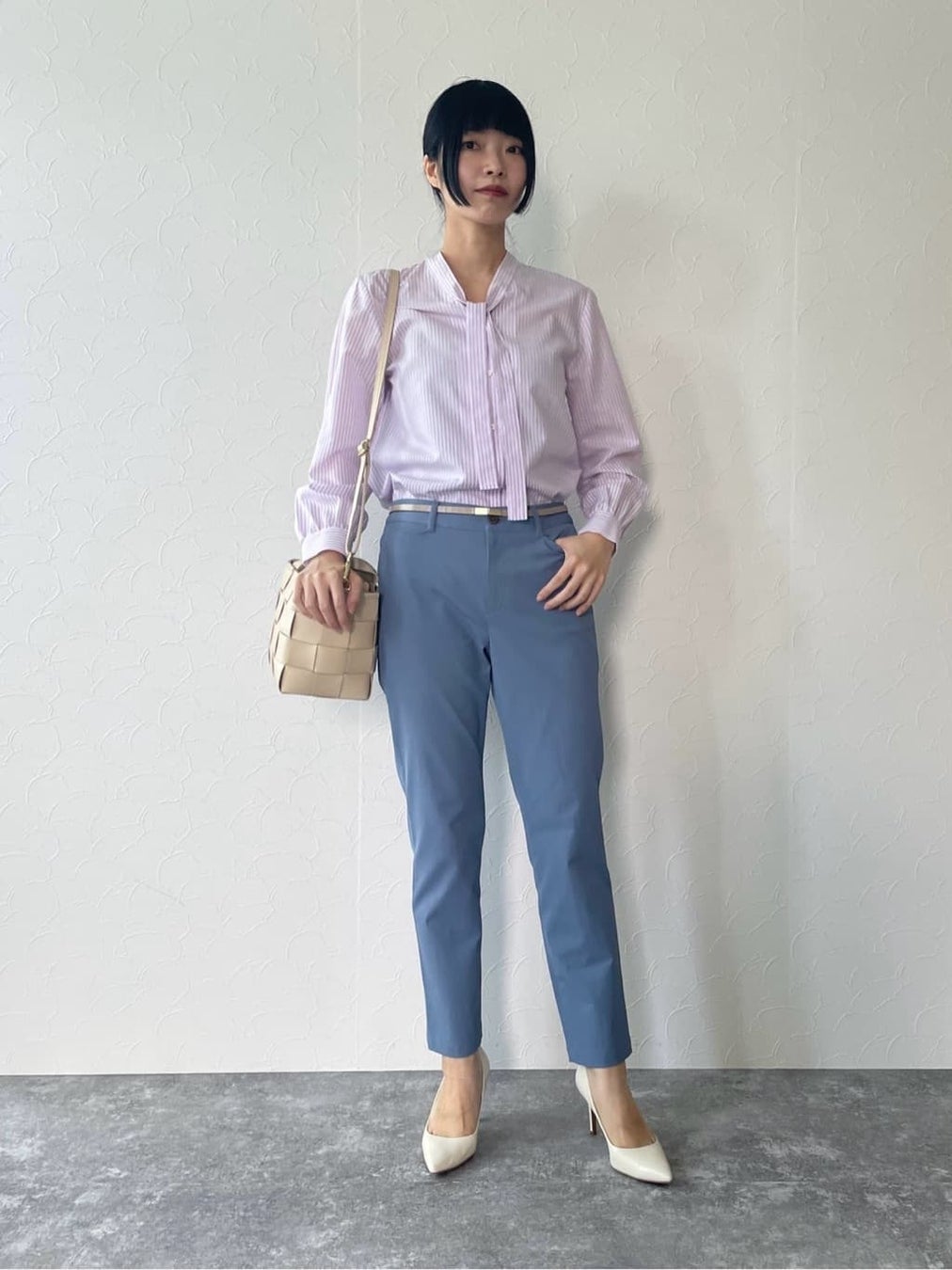 【6月】アウターの要らない日は、ブラウス1枚で軽やかに。紫陽花のようなカラーをチョイスして、この時期らしいムードを演出。