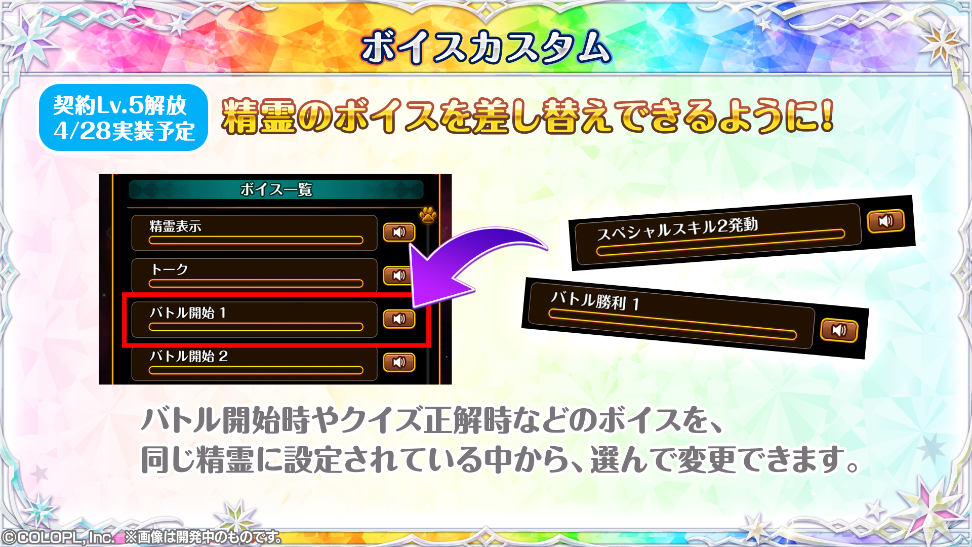 精霊のお気に入りボイスをどこでも聞けるようになります。この機能は深化契約Lv.5で解放されます。同じ精霊であれば、自分の好きなボイスを好きなタイミングに差し替えて再生することができるようになります。また、契約Lv.5の解放で、専用ボイスも3種類解放されます。追加で解放されたボイスもカスタムすることが可能ですので、いろいろ付け替えて楽しんでみてください。こちらも、4/28(木)より実装予定となっております。
