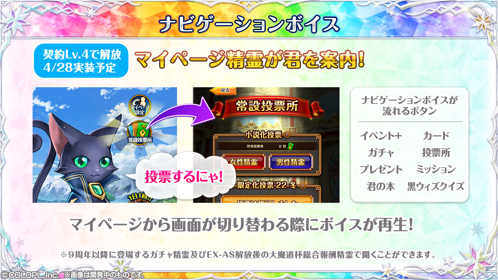 マイページの精霊がプレイヤーを案内いたします。この機能は契約Lv.4で解放されます。マイページにナビゲーションボイス対応した精霊を置いた状態で特定のボタンをタップすると、特別なボイスが流れながら画面が切り替わるようになります。4/28(木)より実装予定となっておりますので、お楽しみに。